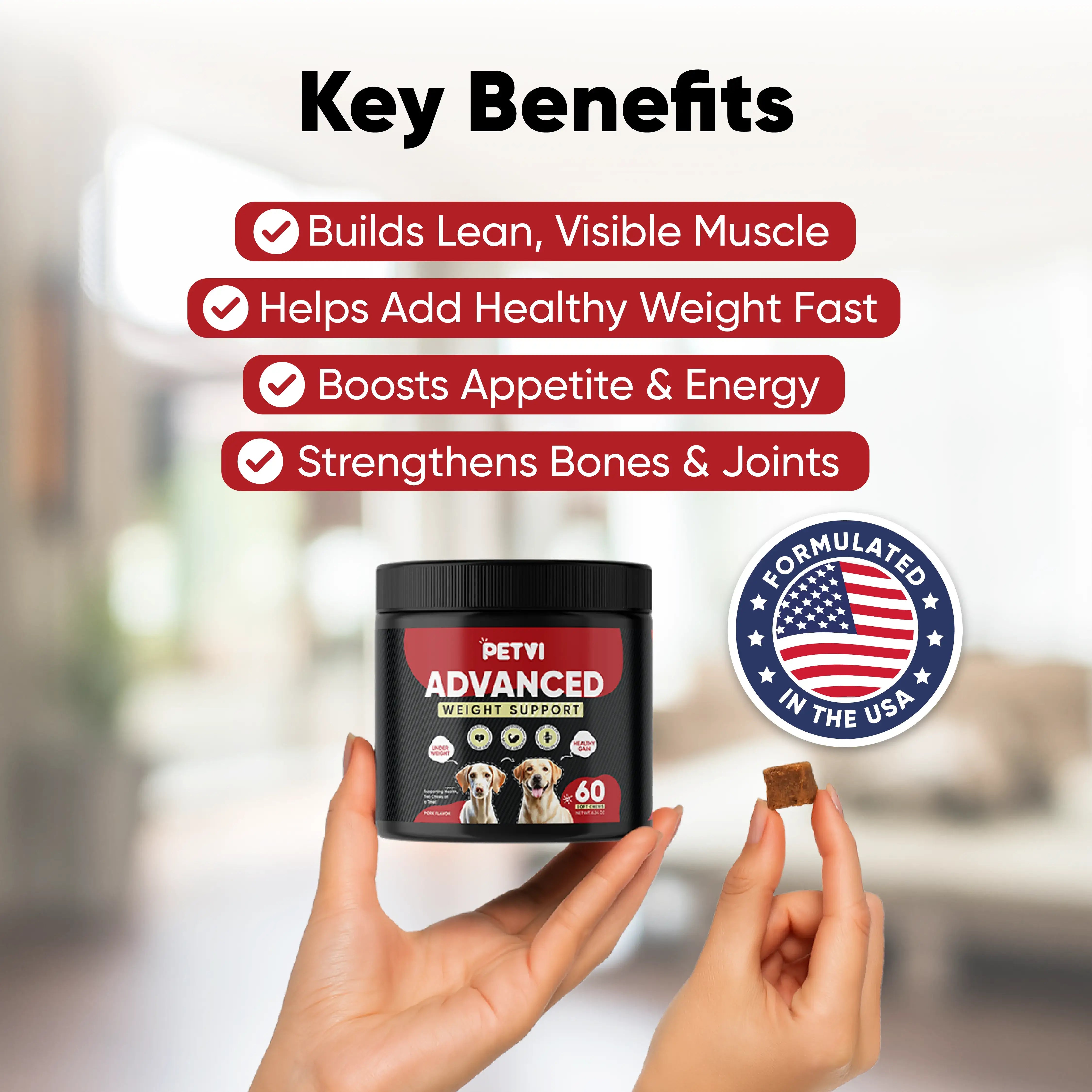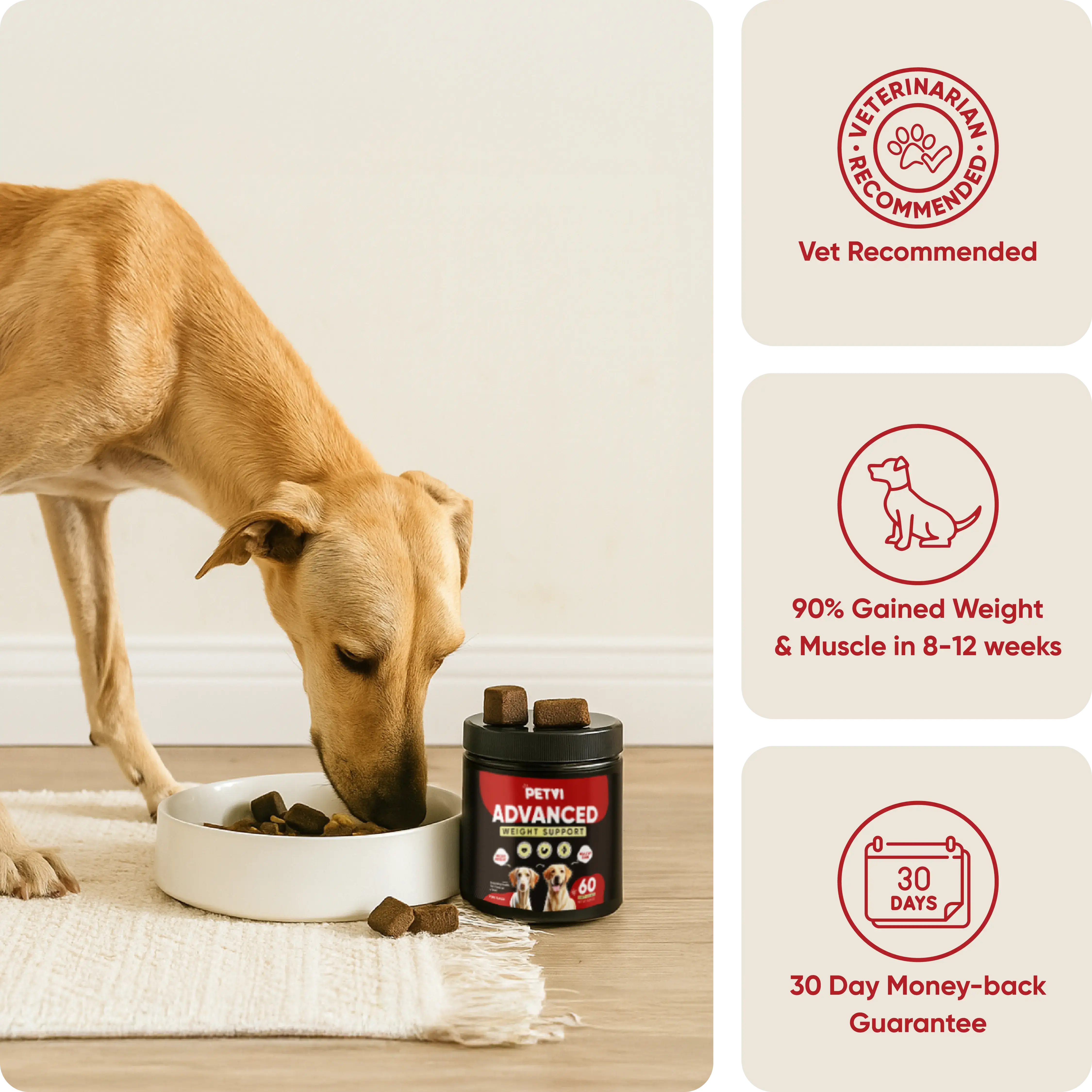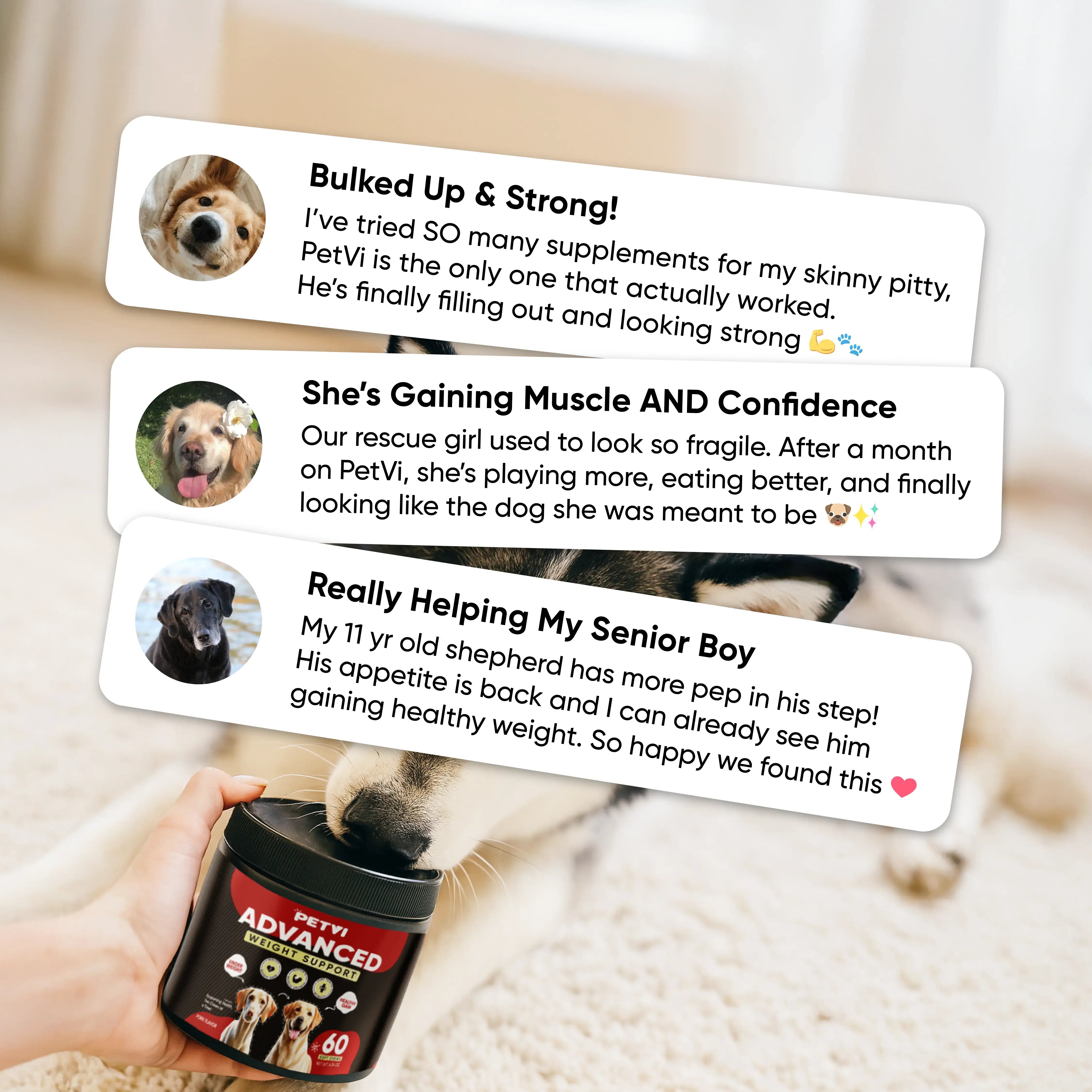 In a series of veterinary-backed studies, dogs supplemented with key nutrients found in PETVI, saw measurable improvements in body composition, energy, and strength.